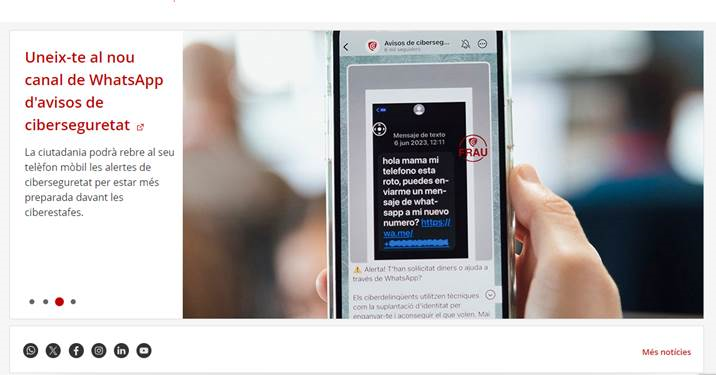Informació sobre un nou canal de WhatsApp que ha creat l'Agència Catalana de Ciberseguretat (https://ciberseguretat.gencat.cat/ca/inici/) que té per objectiu que la ciutadania pugui rebre al seu telèfon mòbil les alertes de ciberseguretat i així estar més preparada davant les ciberestafes.