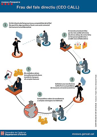 Modalitat delictiva de suplantació d’identitat del directiu d’una empresa o d’un proveïdor/a. Característiques: • Els delinqüents suplanten la identitat del President d'una empresa, el qual es posa en ...