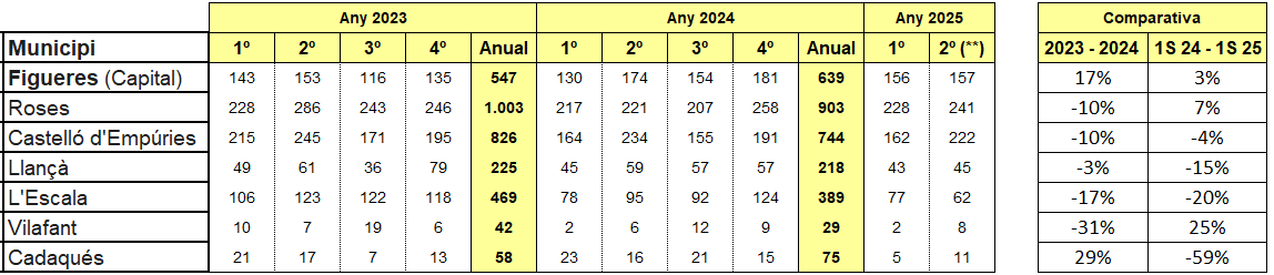En concret, Figueres destaca amb un augment de les transaccions, passant de 130 i 174 operacions en els dos primers trimestres de 2024 a 156 i 157 operacions en 2025. Roses també presenta un increment, amb 228 i 241 operacions comparades amb 217 i 221 l’any anterior. Castelló d'Empúries manté un comportament similar, amb 162 i 222 operacions respecte a 164 i 234, mentre que municipis més petits com Llançà, L’Escala, Vilafant i Cadaqués mostren una caiguda significativa.