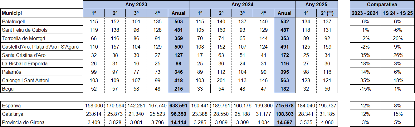 En canvi, alguns municipis mostren una tendència a la baixa. Sant Feliu de Guíxols combina un primer trimestre positiu amb una reculada en el segon. Santa Cristina d’Aro presenta una de les davallades més significatives, amb una reducció superior al 25% en la comparativa semestral, mentre que Calonge i Sant Antoni també registra un descens important respecte a l’any anterior. Per la seva banda, Begur es manté relativament estable, amb una variació molt moderada entre el 2024 i el 2025.